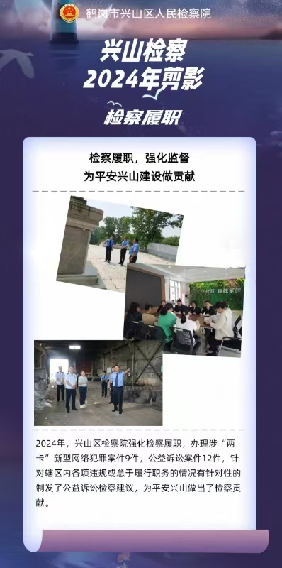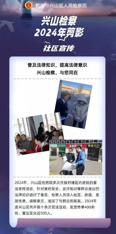 2024年,鹤岗市检察机关坚持以习近平新时代中国特色社会主义思想为指导,学思践悟习近平法治思想,依法全面履行法律监督职责,不断做实为大局服务、为人民司法、为法治担当,全体检察人员人心齐、干劲足、风气正,以凝心聚力之姿迈出检察工作现代化的坚实步伐,以唯实争先之举交出了检察工作高质量发展的高分答卷。即日起,鹤岗市院“两微一端”特开设“2024年度盘点”专栏,全面展现全市两级院履职印迹,以期续写往日荣光,再谱奋进新篇。本期为您推送《兴山区检察院:与您同在 为民司法》。
